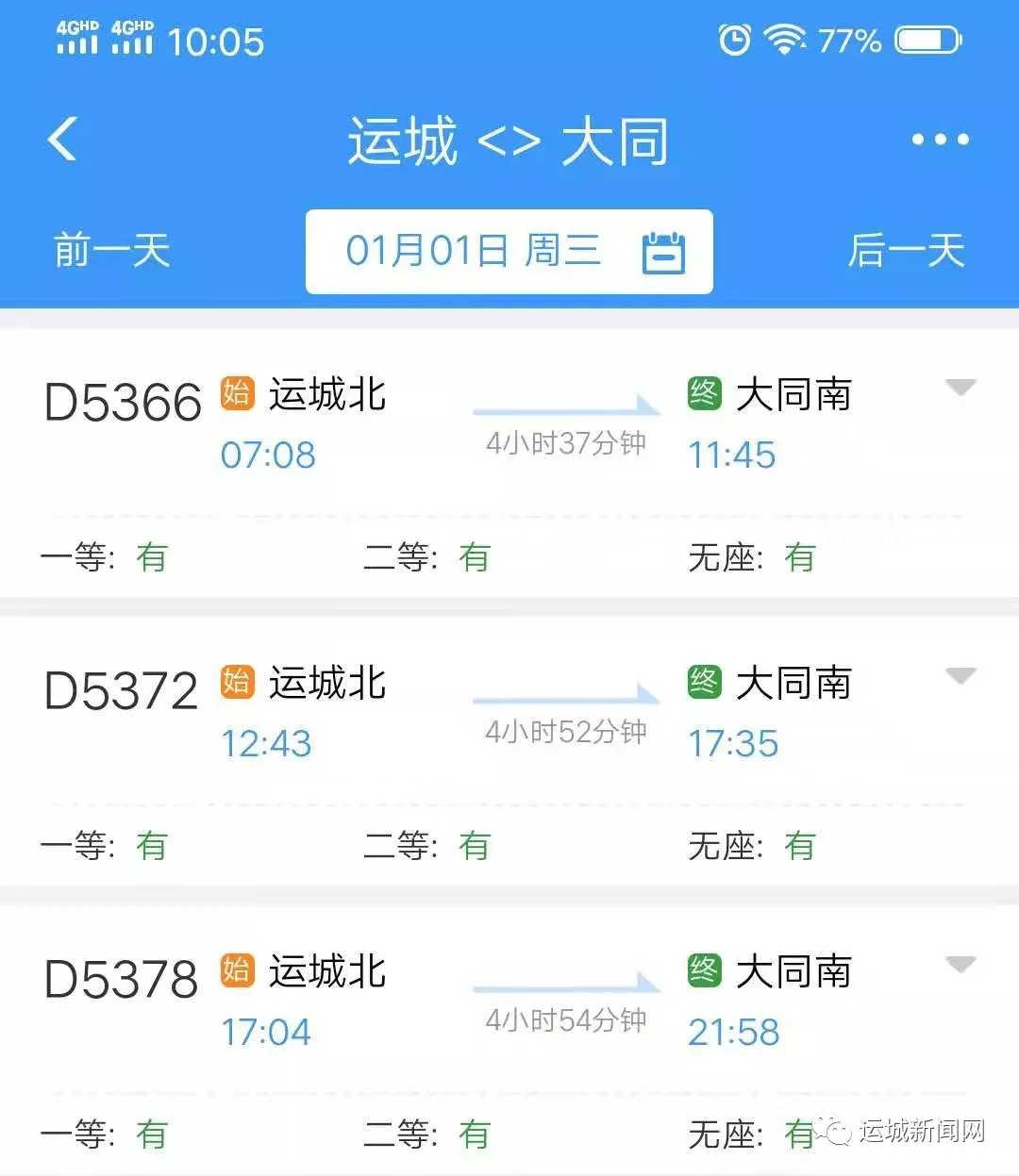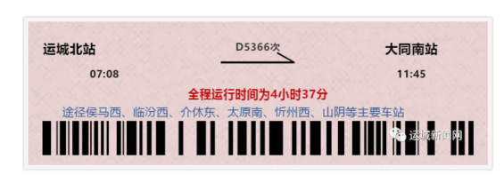 运城新闻网讯(记者 王运涛)从中国铁路客户服务中心网站(www.12306.cn)获悉,2019年12月30日0时起,全国铁路实施新的列车运行图,此次调图,随着大同至西安高速铁路全线开通运营,运城北站至大同南站间将首次开行动车组列车。最快仅需要4小时37分就可以达到,相比普通列车可节省时间7小时以上。