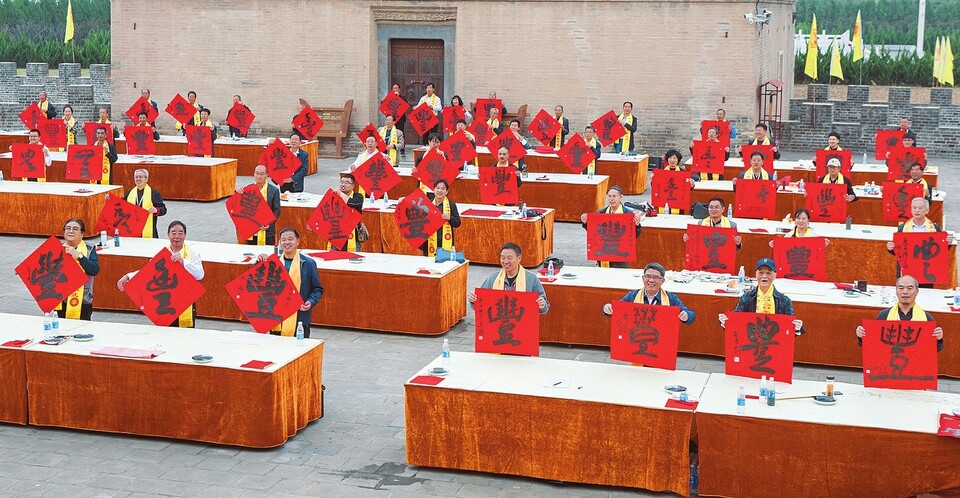 9月22日,万荣县的100位书法爱好者书写了100个大“丰”字,赠送给农民朋友。 李克荣摄