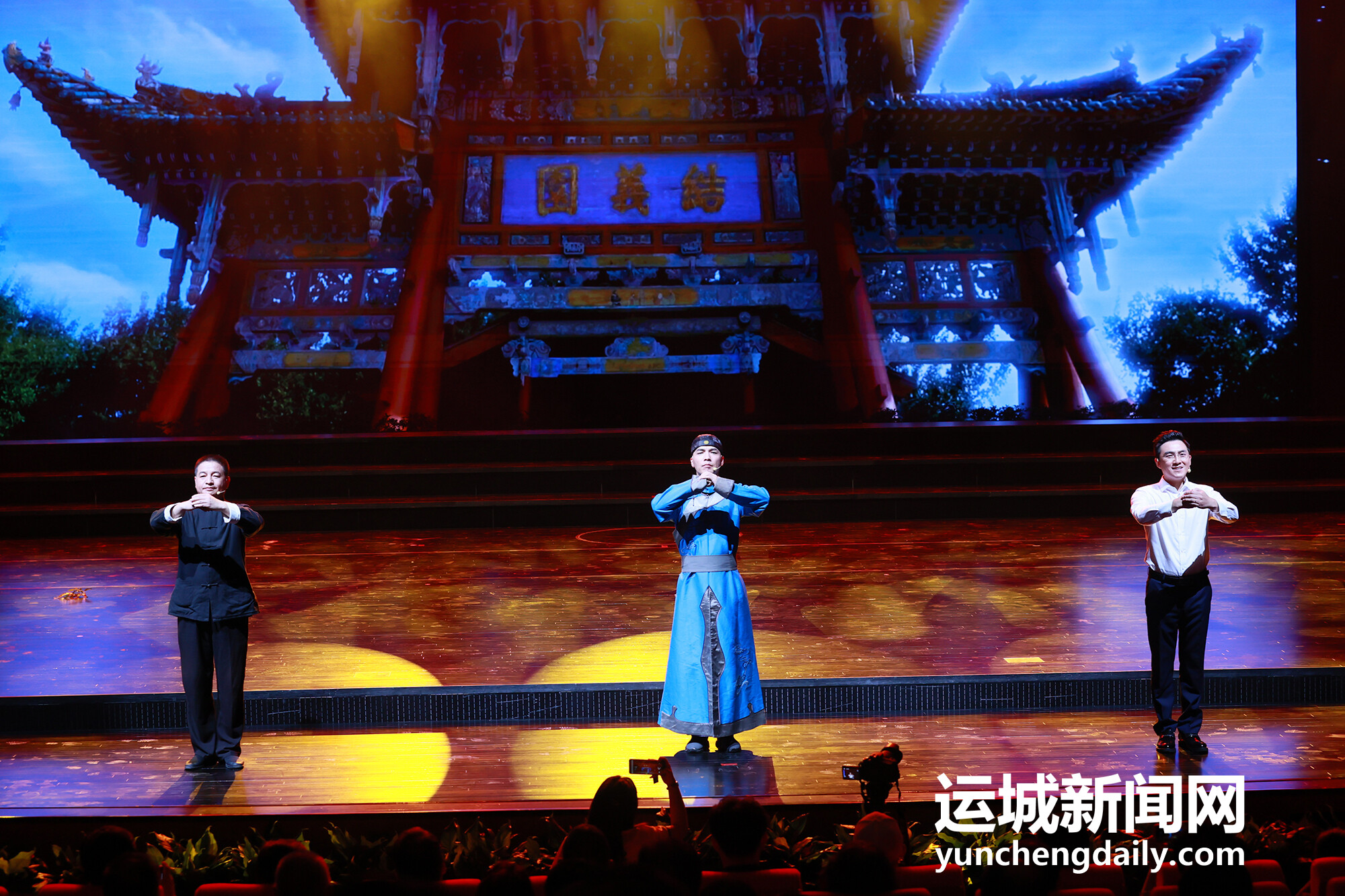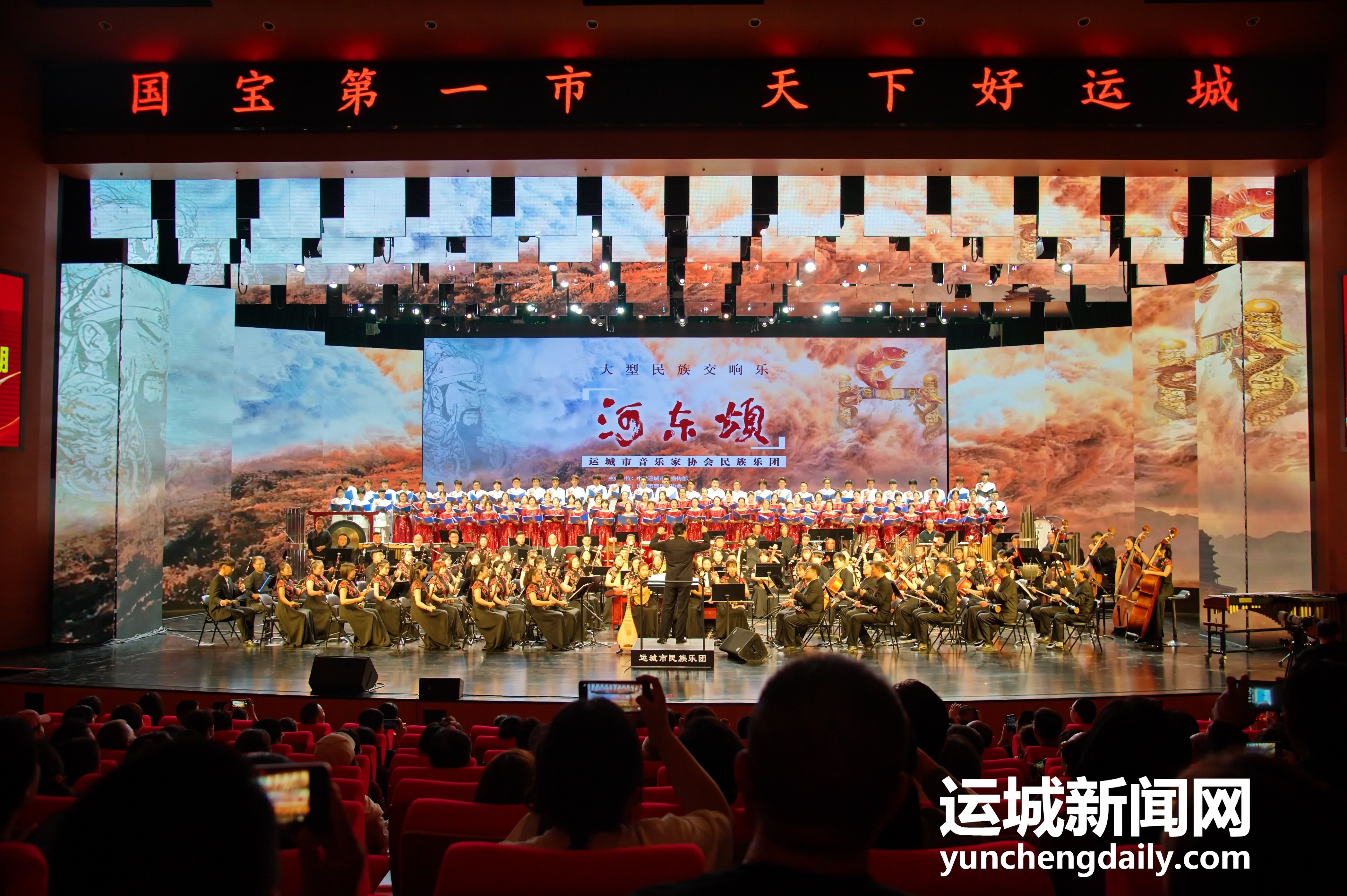 音符也成为思念与书写关公史诗的注脚。9月22日晚,运城会展中心,近千名观众的掌声响彻会场,我市第一台完整的大型民族交响乐《河东颂》演出成功。现场观众在音乐的引导下模仿国家级作曲、指挥景建树的指挥动作,辨别琵琶、马林巴、二胡等乐器中蕴藏的音乐场景与情感,更有不少音乐爱好者到后台与演出团队合影留念。“太好了!太棒了!听不够!”成为当晚能听到的最多的赞美。210人的演奏团队,近1个月的精心排练,跨越数年的创作历程,这部描绘“大河之东—关公故里—黄河臂弯”空间景象的乐章,将“忠义仁勇”的关公精神用音符倾泻而出,高潮迭起、隽永恢弘。大型民族交响乐《河东颂》由合唱《河东颂》、民族交响乐《关公颂》《龙门颂》3部分组成,演出结束后,该部乐章确定更名为《河东三颂》。
