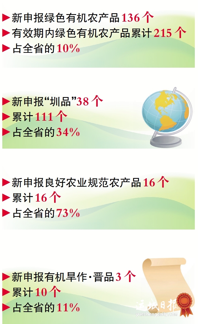 数据显示,近两年来,我市新申报绿色有机农产品136个,有效期内绿色有机农产品累计215个,占全省的10%;新申报“圳品”38个,累计111个,占全省的34%;新申报良好农业规范农产品16个,累计16个,占全省的73%;新申报有机旱作·晋品3个,累计10个,占全省的11%;永济黄河鲤鱼、万荣柴胡、芮城黄桃等8个产品入选全国名特优新农产品名录,累计55个,占全省的33%,品牌总数稳居全省第一。运城苹果、临猗苹果分别以品牌价值75.21亿元、51.38亿元入选2024中国品牌价值评价区域品牌(地理标志)百强榜第47位、78位;夏县西瓜以品牌价值10.73亿元位列全国西瓜类品牌价值前列,全市区域品牌总价值达177.42亿元。