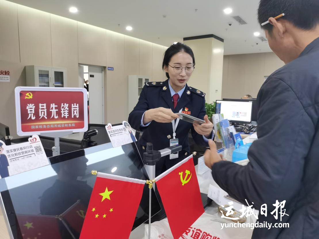 ▲芮城县税务局在“人民之家”(政务服务中心)办事窗口设立党员先锋岗,竭诚为民服务。图为税务干部为办税群众宣讲政策。