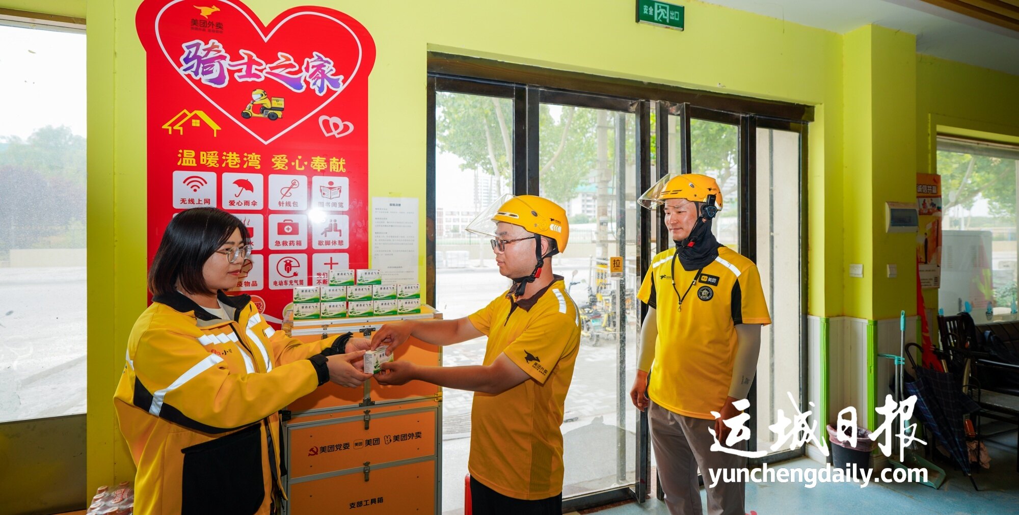 ▲芮城县以“党建+”为破题之匙,不断增强党在新兴领域的号召力、凝聚力、影响力。图为近日美团外卖党支部为美团骑手发放藿香正气水。