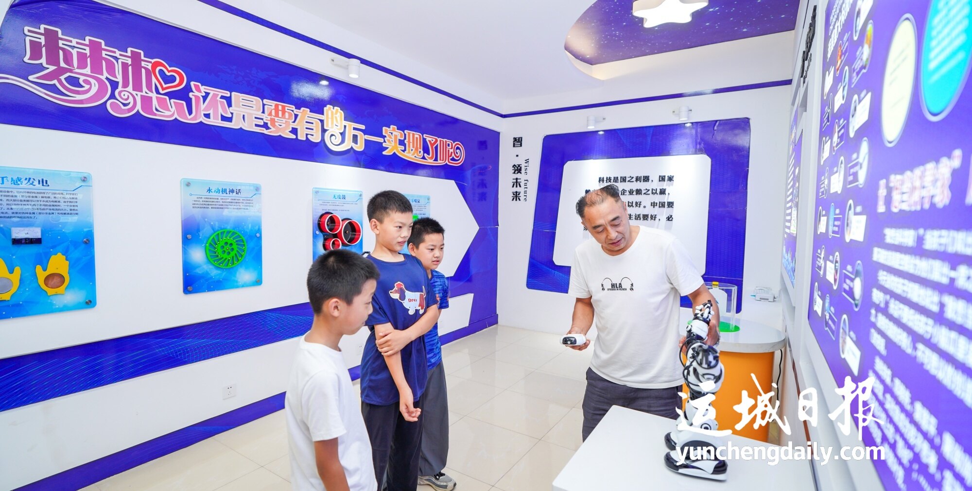 ▲亚宝社区近年来着力打造“活力家园·健康社区”品牌。图为亚宝社区党支部书记高波在健康科普馆为孩子们讲解机器人。