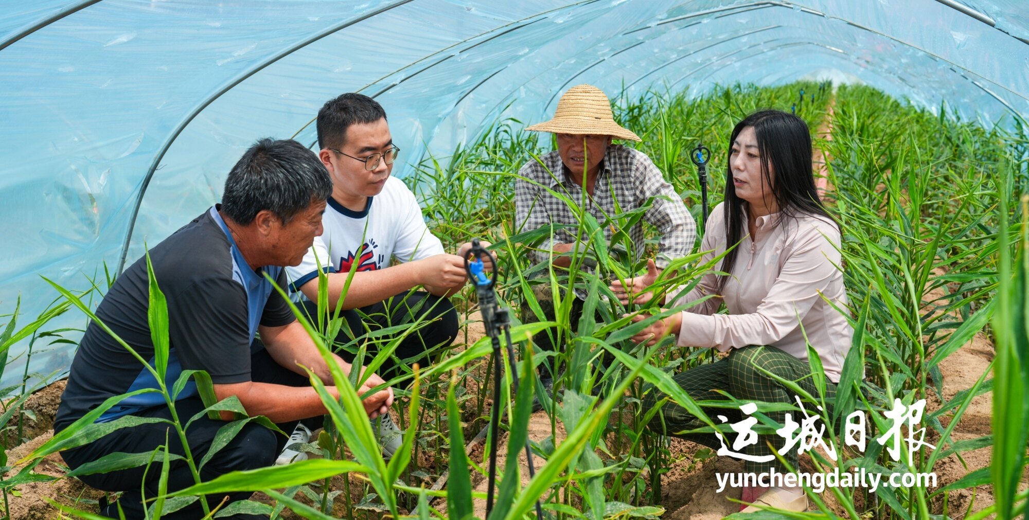 ▲南磑镇东张联村引进山东优质生姜品种进行本土化验证种植。图为东张联村到村工作大学生张瑞杰、驻村干部刘娟妮与村民查看引进的生姜种植情况。