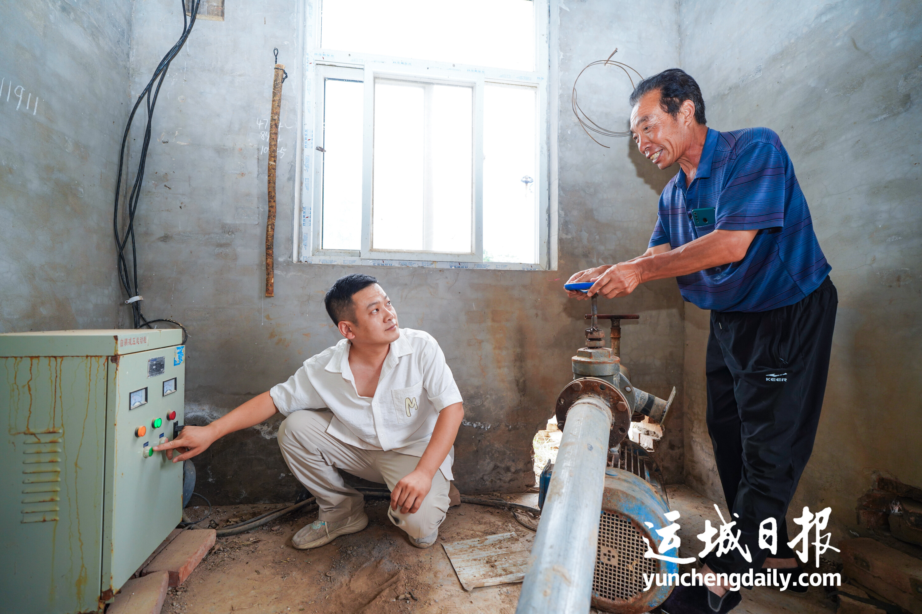 ▲面对干旱天气,芮城县干群合力确保“三夏”工作顺利推进。图为东垆乡东吕村到村工作大学生郑江帅和村干部在水房检查设备,保证农田灌溉不受影响。