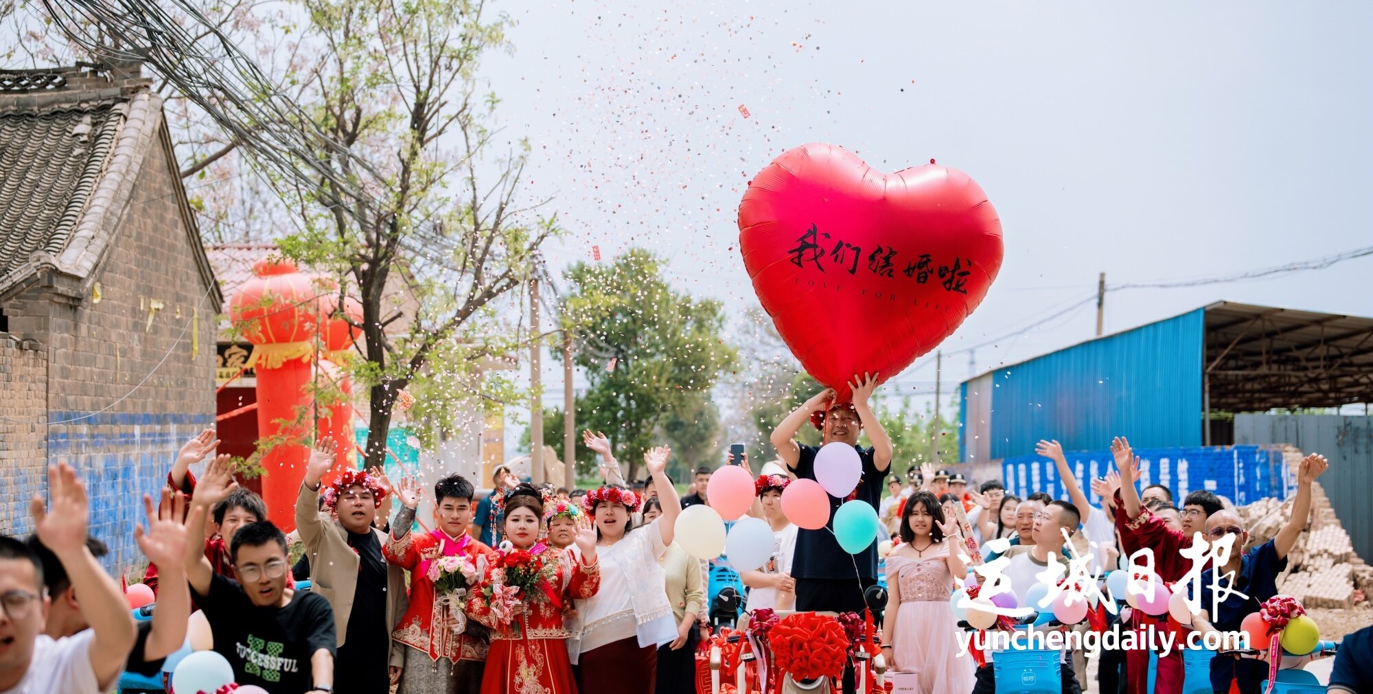 ▲芮城县深入推进移风易俗工作,教育引导人民群众自觉践行文明婚嫁新风尚。图为学张乡新人骑电动“小喜车”迎亲,节俭环保婚礼获群众点赞。