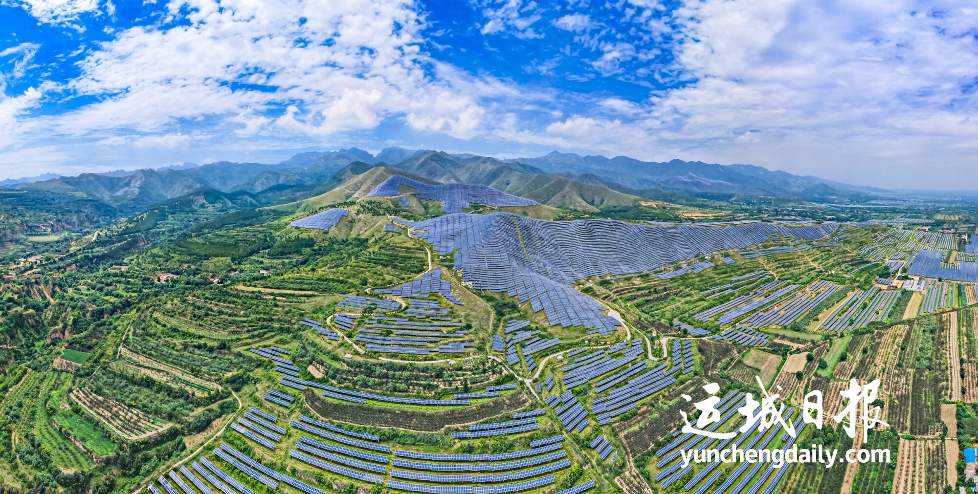 ▲芮城县近年来积极探索光伏产业发展新模式,将荒山荒坡变为“金山银山”。图为光伏领跑技术基地与蓝天白云相互映衬,构成一幅绿色能源新画卷。