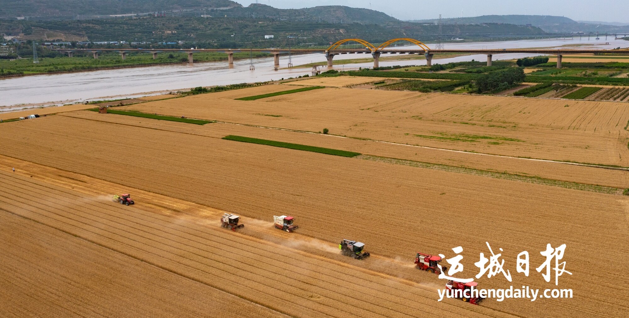 ▲芮城县是产粮大县,今年小麦种植面积达到49.7万亩。夏收时节,当地党委、政府积极做好农机调度、技术服务等工作,确保夏粮颗粒归仓。图为收割机收割小麦的场景。