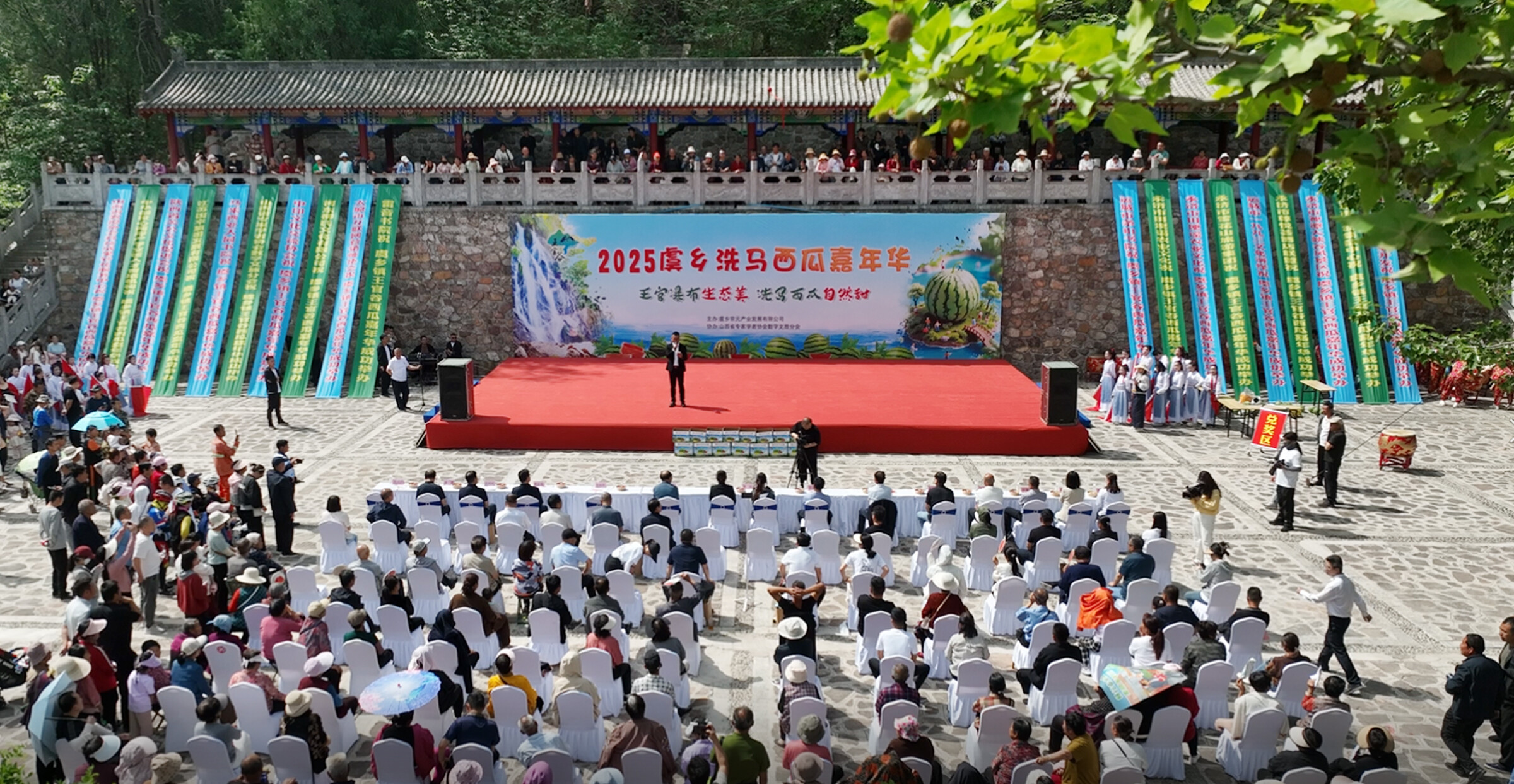 ▲永济市坚持党建引领,推动农商文旅深度融合,助力乡村全面振兴。图为永济市虞乡镇“王官瀑布生态美 洗马西瓜自然甜”洗马西瓜采收季嘉年华活动现场。