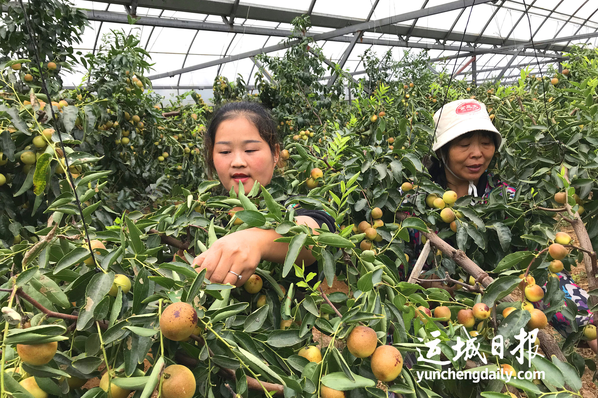 ▲永济市坚持打造品牌农业强市,通过党建引领推动乡村产业振兴。图为永济市开张镇东开张村枣农在设施冬枣大棚采摘冬枣。