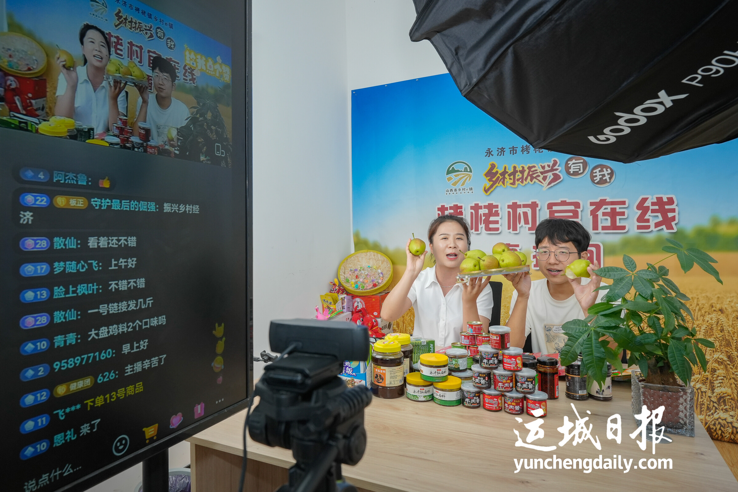 ▲永济市依托“乡村e镇”开展助农直播,为基层治理注入新理念、新活力,为推进乡村全面振兴提供新动能、新载体。图为永济市栲栳镇到村工作大学生在助农直播。