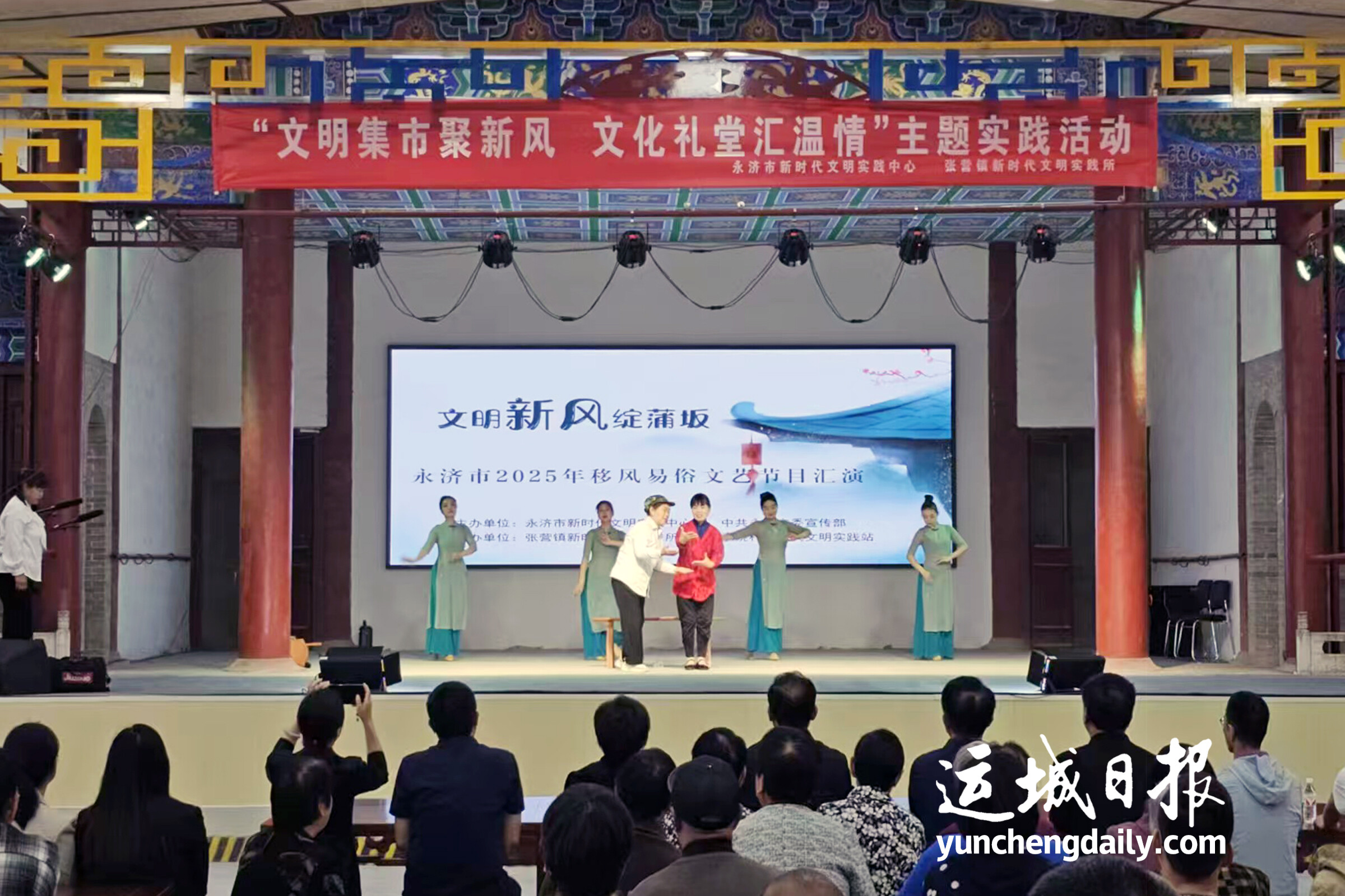 ▲永济市积极培树文明乡风,创作快板《人生宴席莫铺张》、情景剧《退彩礼》等移风易俗精品节目,通过“接地气”“有生气”的文艺宣传,让文明乡风浸润人心。图为永济市开展“文明新风绽蒲坂”移风易俗文艺节目会演。