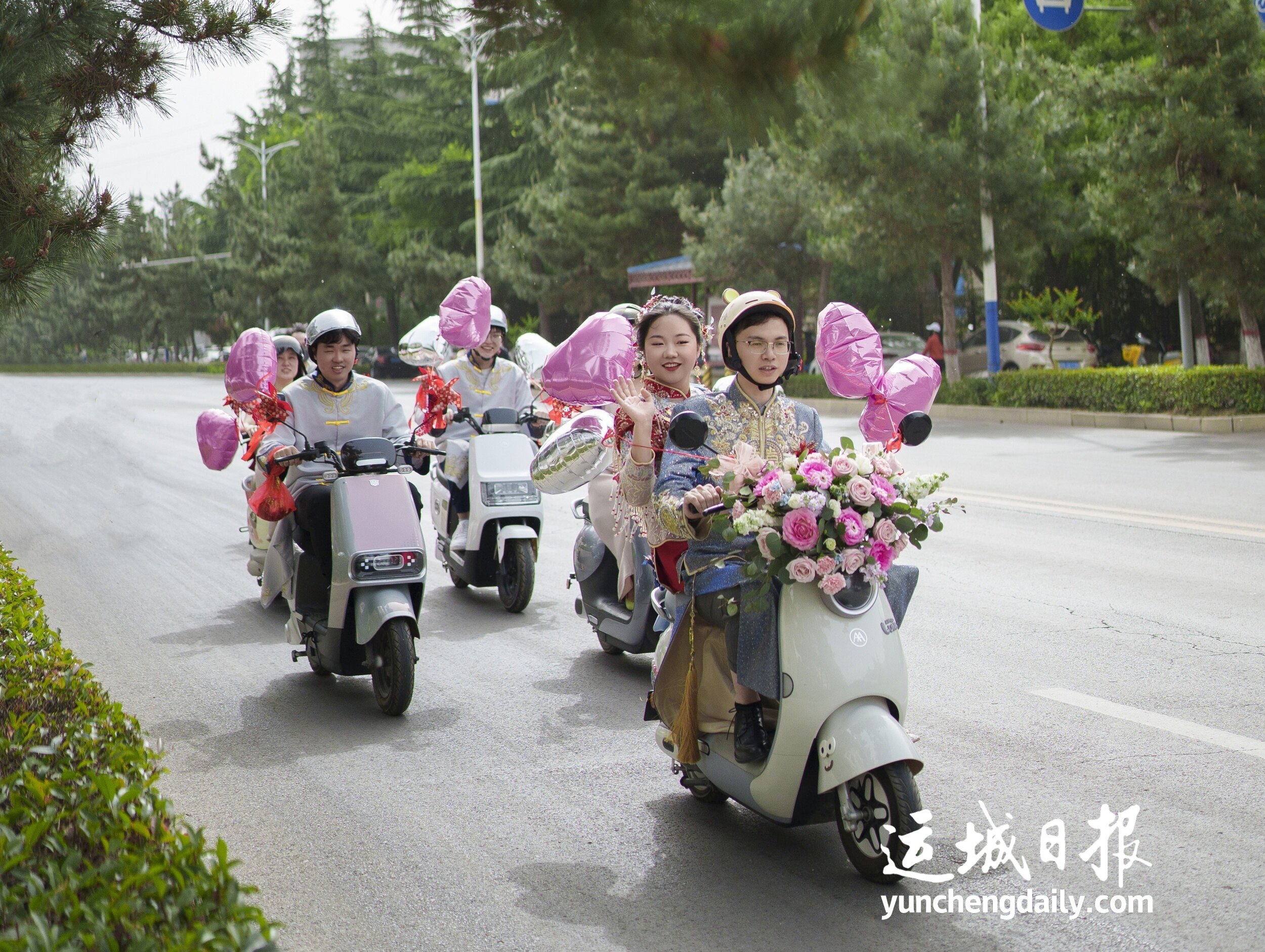 ▲永济市深入推进移风易俗,积极倡导文明新风,持续营造让彩礼“降温”、为爱情“减负”、给幸福“加码”的良好氛围。图为永济市组织的“一对新人”骑行迎亲活动现场。