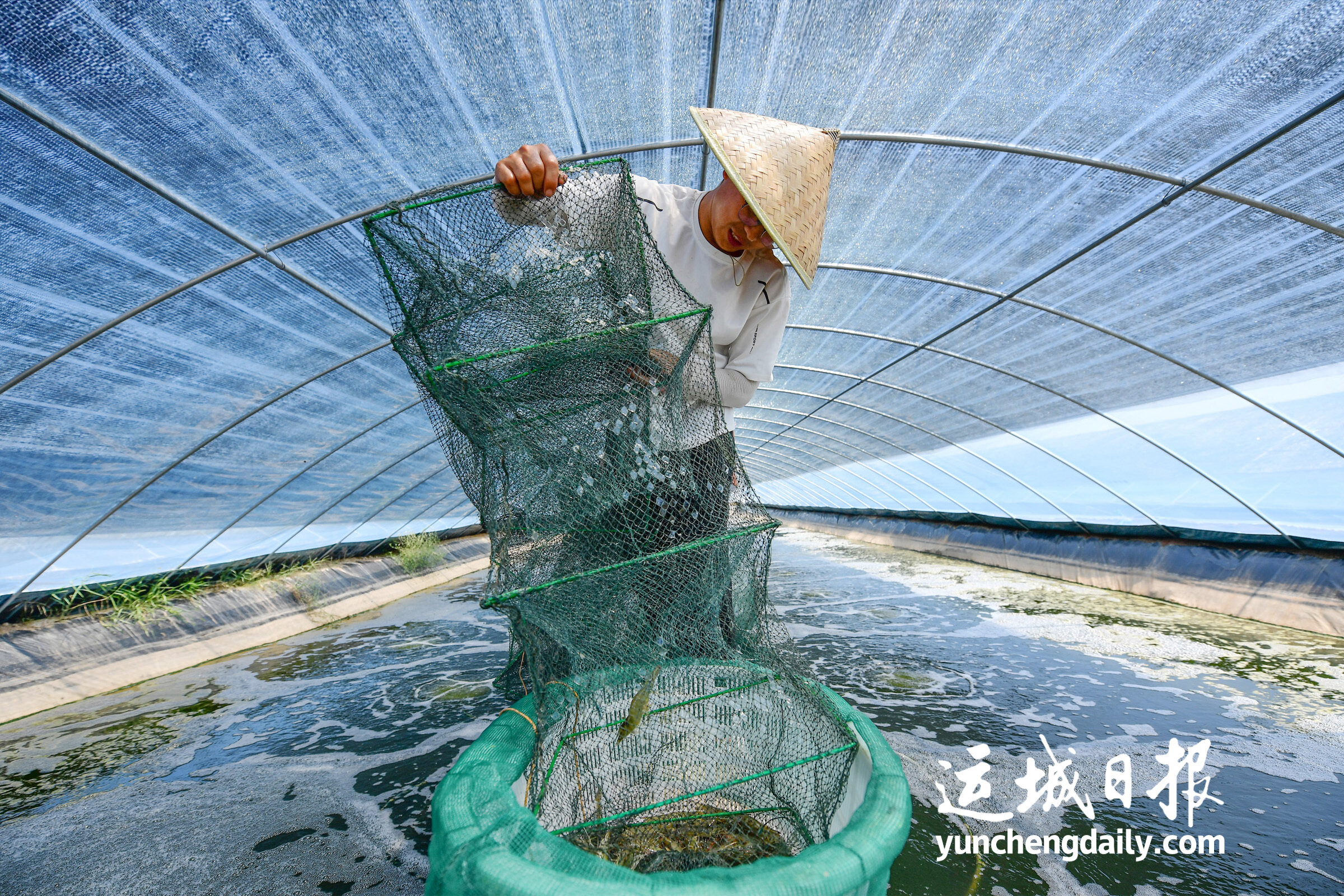 ▲永济市通过党支部领办合作社等多种方式发展壮大村级集体经济。图为专业养殖人员在永济市开张镇西开张村千亩南美白对虾养殖基地捕虾。