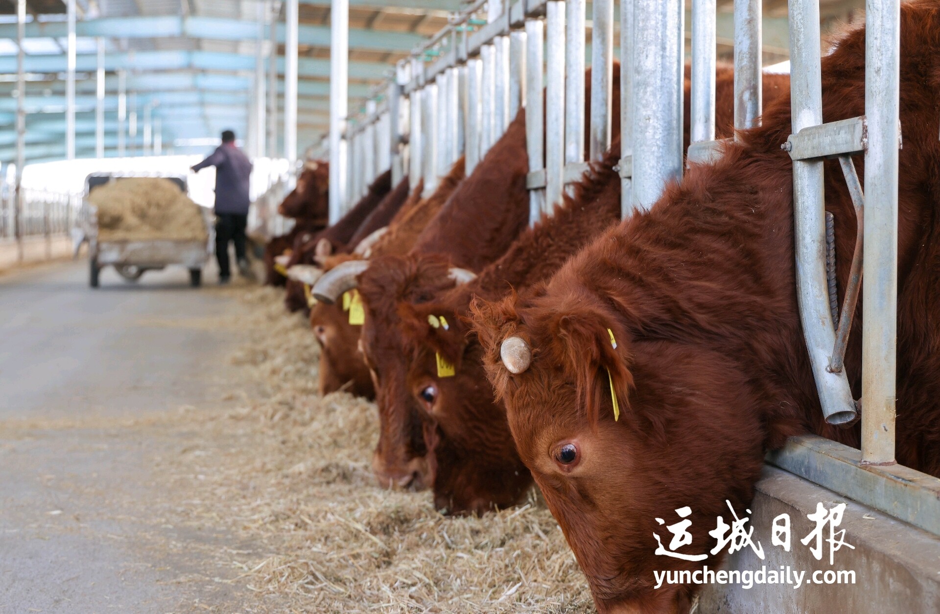 万荣鸿瑞祥养殖有限公司内,工人在投喂晋南大黄牛。 记者 金玉敏 摄
