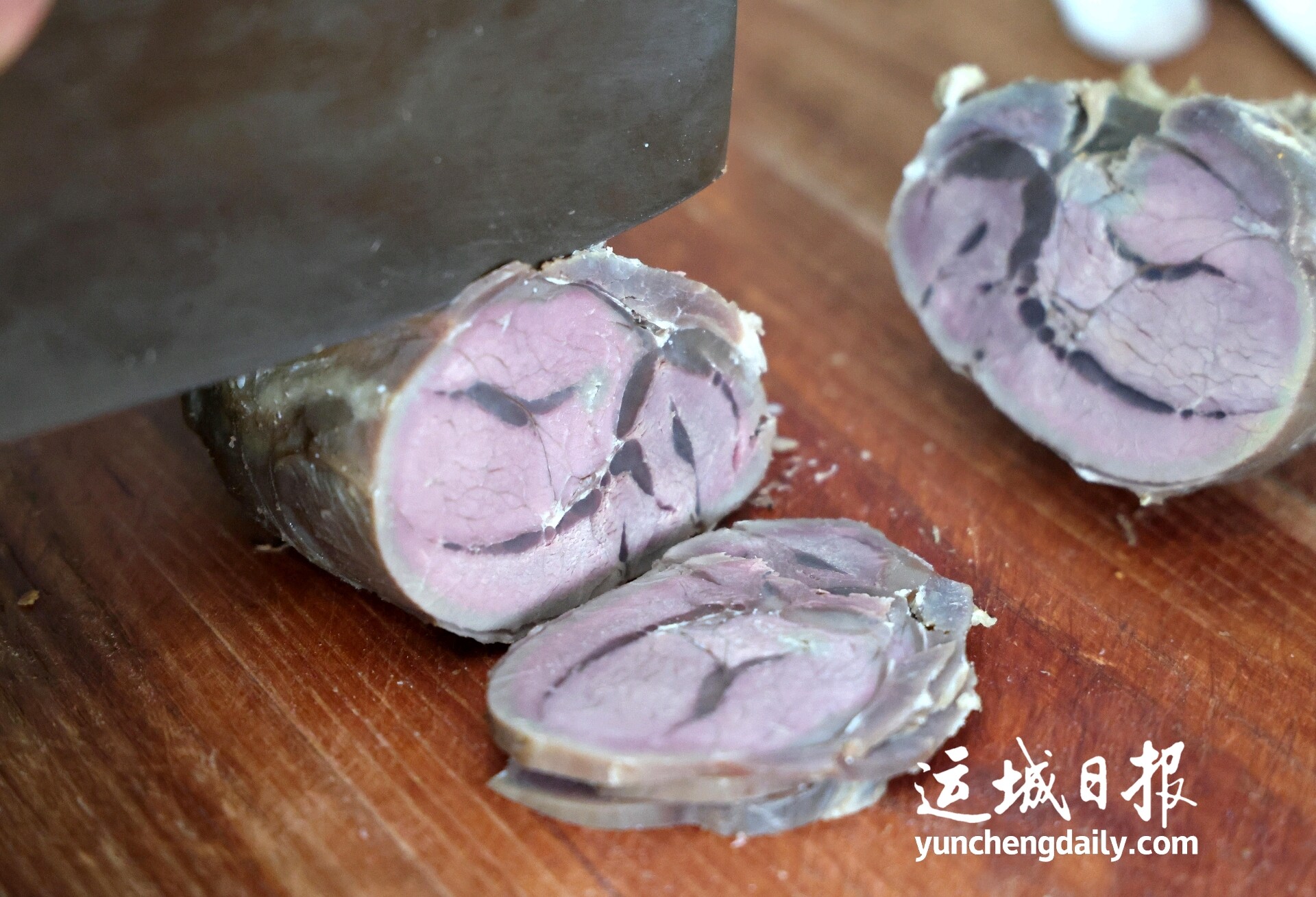 永济市老丁家牛肉店内,工作人员在切卤牛肉。