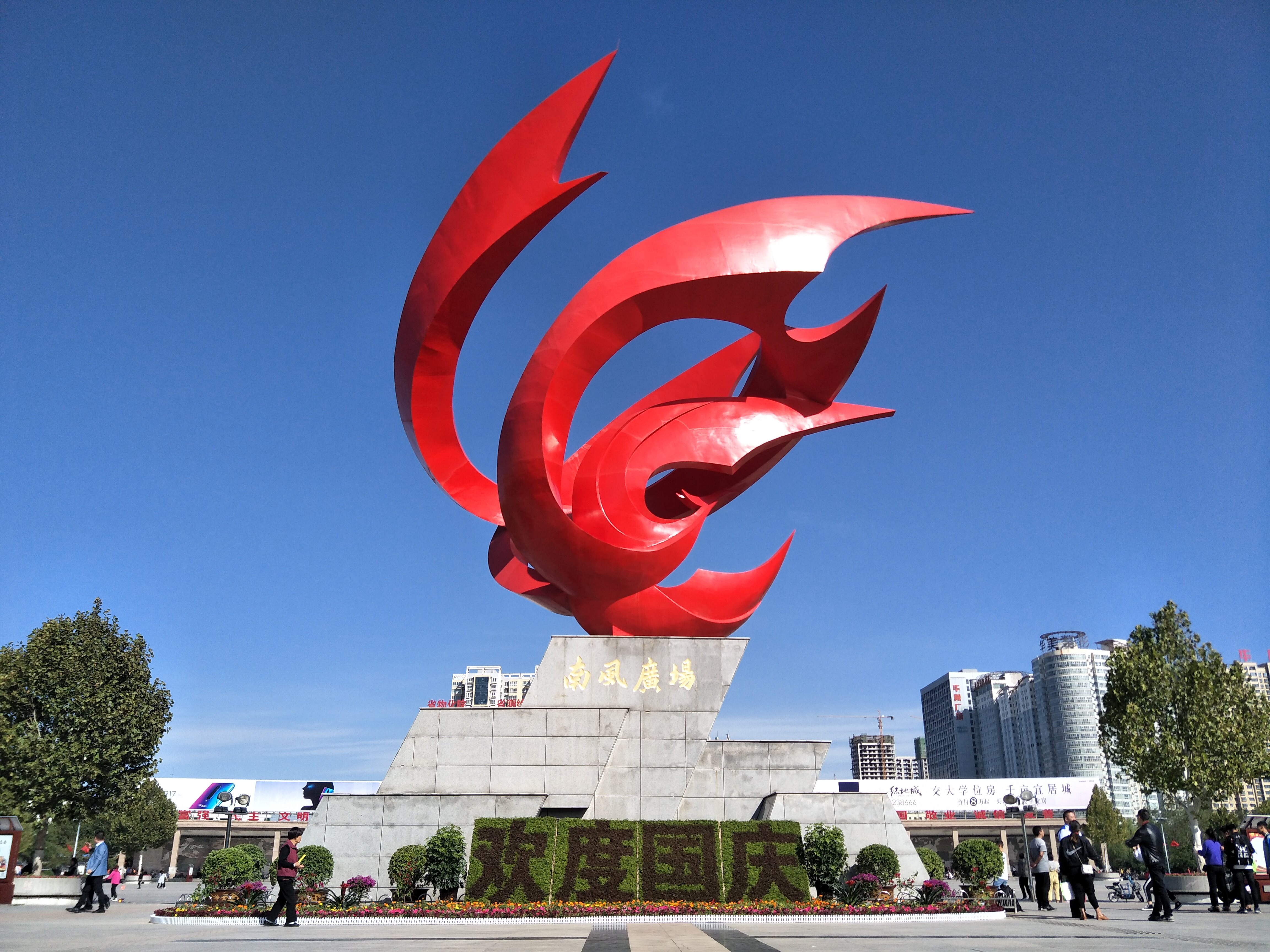 运城晚报讯(记者 范楚乔)9月29日上午,市区南风广场上鲜艳的五星红旗迎风飘扬,旗杆下整齐地摆放着各色盆栽;主雕塑“凤舞祥韵”前的“欢度国庆”花坛旁,不时有市民驻足留影;圆心广场上的树坑中摆放的盆栽,组成了不同的彩色图案;步行街临街店铺门前悬挂着崭新的国旗……为迎接国庆,凤凰城的“城市客厅”装扮一新。