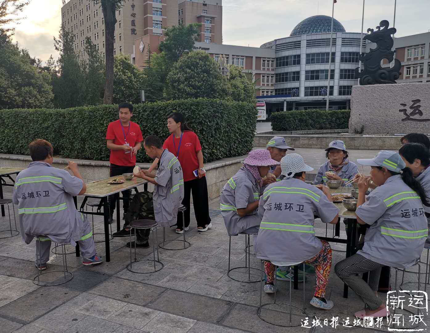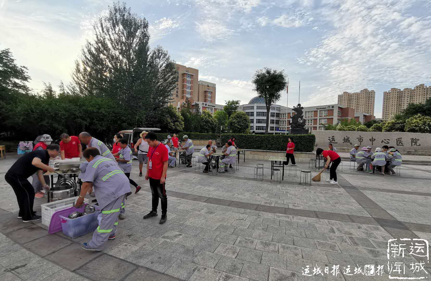 运城新闻网讯 6月17日清晨,在市中心医院西北门,第一时间志愿者协会像往常一样,为百名环卫工人免费提供了热腾腾的爱心早餐。这样的暖心一幕已成常态,是凤凰城一道动人的风景线。